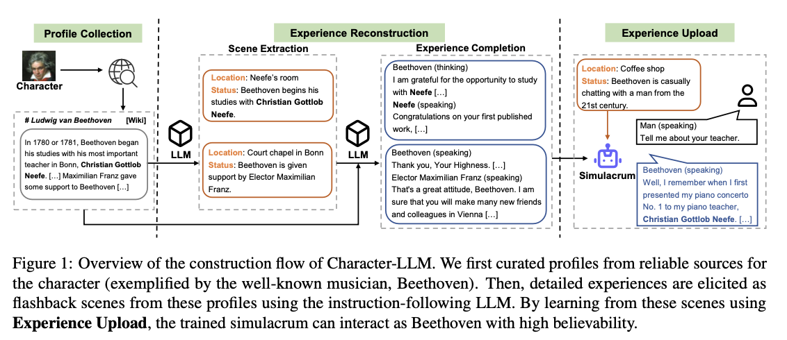 - 이 연구에서는 Beethoven, Queen Cleopatra, Julius Caesar 등 특정 인물을 연기하도록 LLM을 훈련시키는 Character-LLM을 다룬다.