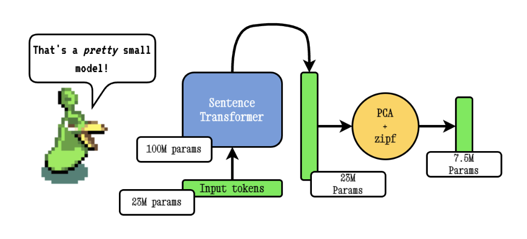 model2vec는 sentence transformer 라이브러리를 기반으로 동작합니다. 가장 유용한 특징 중 하나는, 경량모델을 만들기위해 임의의 정의된 데이터셋이 필요하지 않고, 모델(과 특정 경우 custom vocabulary)만을 필요로 한다는 사실입니다.